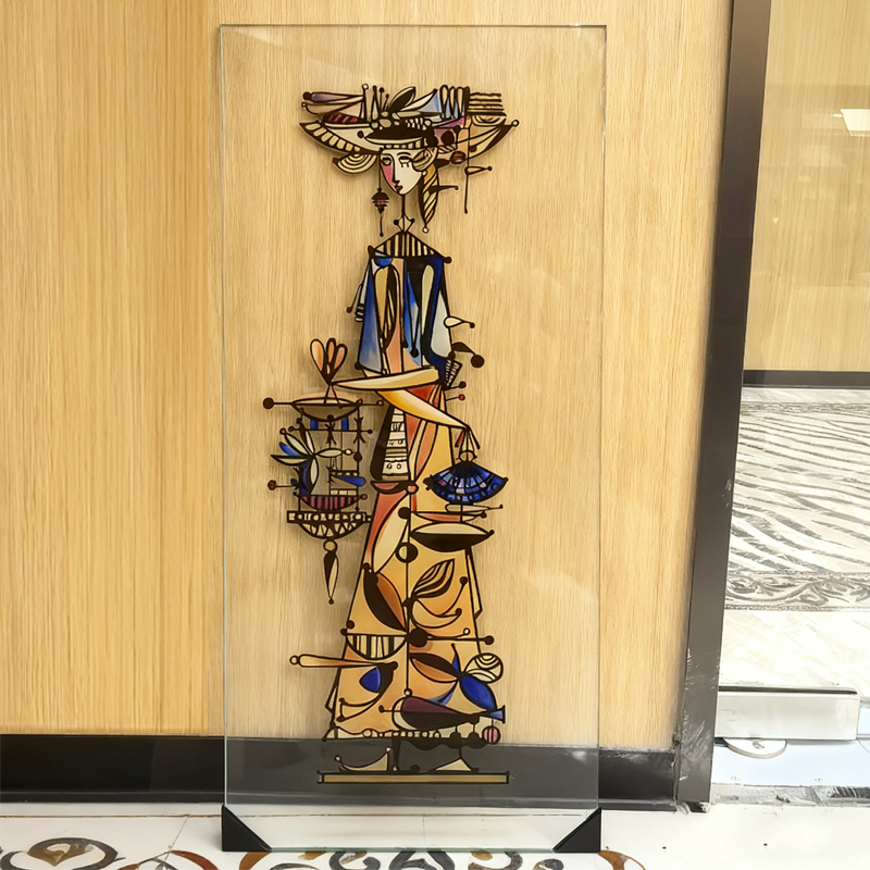 The artistic design of the digital printed glass in the picture is full of integrated thinking about traditional and modern aesthetics. The main body of the picture is a character image with gorgeous clothing and complicated decorations. Its design language not only pays tribute to traditional clothing culture, but also endows it with a strong modern art style through abstract and geometric artistic processing.